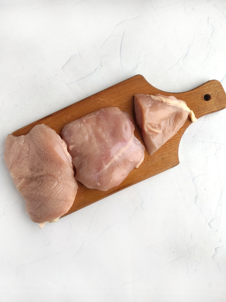 1.Place the chicken fillets on a board. Cut off the sharp tip and set aside. Use it for other dishes. Cut the remaining portion into 2 equal portions. You will need one piece per serving.