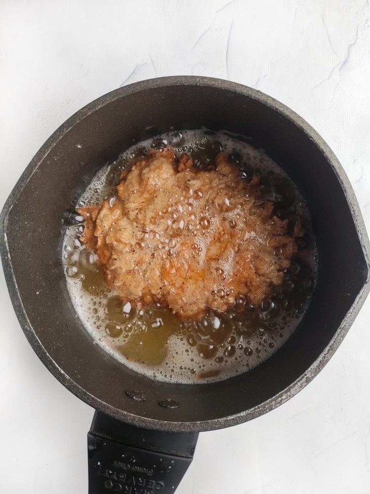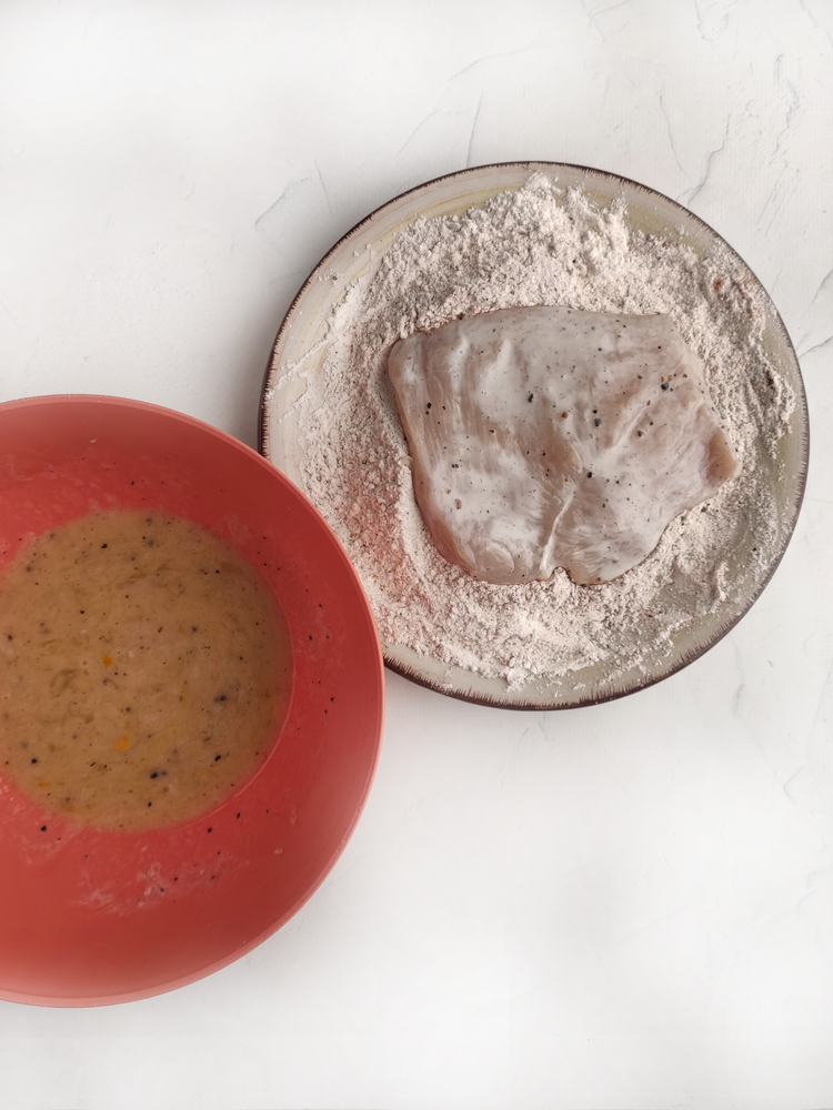 4. Beat the egg with 4 tbsp. of buttermilk marinade. Transfer the chicken fillets to the breading and coat on all sides. Transfer the chicken to the egg mixture and then back to the breading. The more uneven the coating, the more interesting the texture will be.