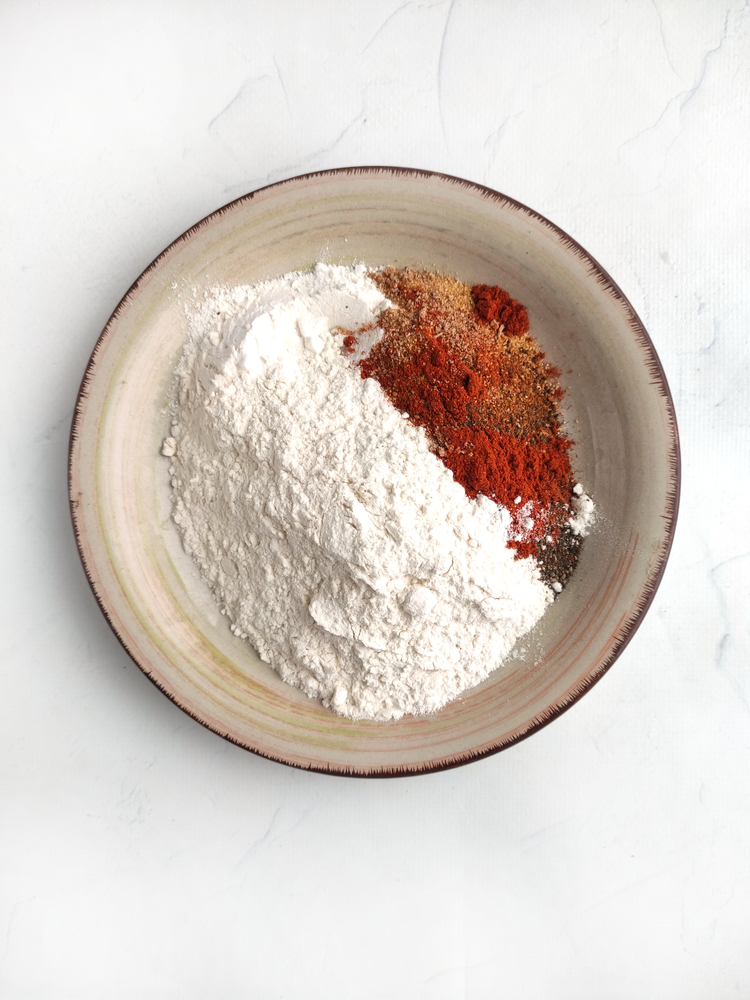2. Set aside 1/2 tsp. salt and pepper to make the marinade. Mix the remaining spices with the flour, starch, and leavening agent on a flat plate. Use a dry whisk to stir.