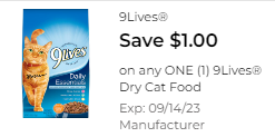 Use 1 Save $1.00 on any ONE (1) 9Lives® Dry Cat Food (no restrictions)