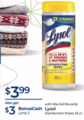 Deal; Lysol Wipes 35 CT $3.99 Get $3.00 Bonus Cash; Limit 2