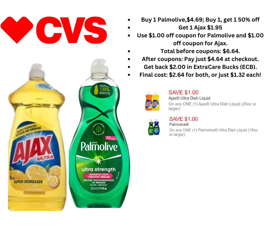 Take advantage of this great deal at CVS on Palmolive and Ajax dish soaps! From September 1st to September 14th, buy 1, get 1 50% off, plus earn $2 ExtraBucks Rewards when you purchase 2.