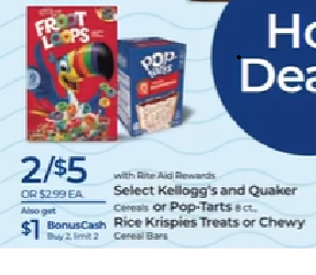 Select Kellogg's and Quaker Cereals or Pop•Tarts 8 ct., Rice Krispies Treats or Chewy Cereal Bars; 2/$5.00; Buy 2 Get $1.00 Bonus Cash