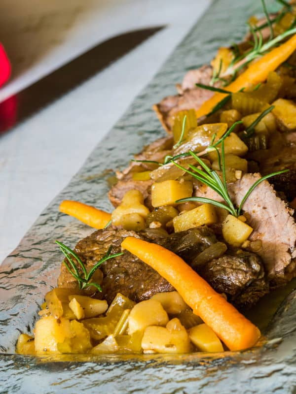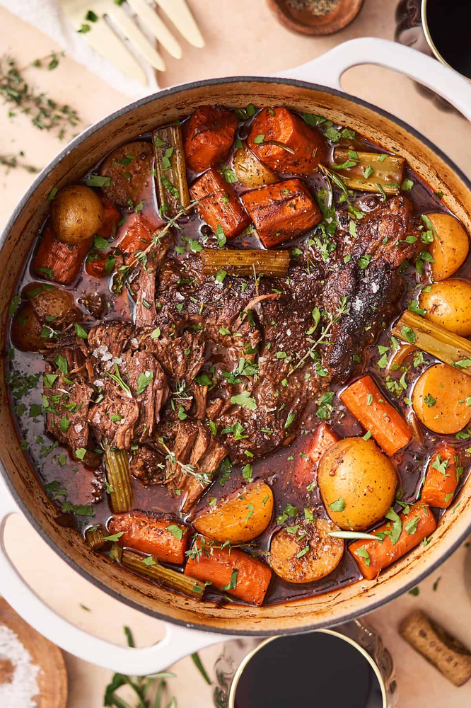 Pop a pot roast into the Dutch Oven with carrots, celery and potatoes for a hearty and wholesome family meal that everyone will love. This reheats well for leftovers for lunch if you have them!