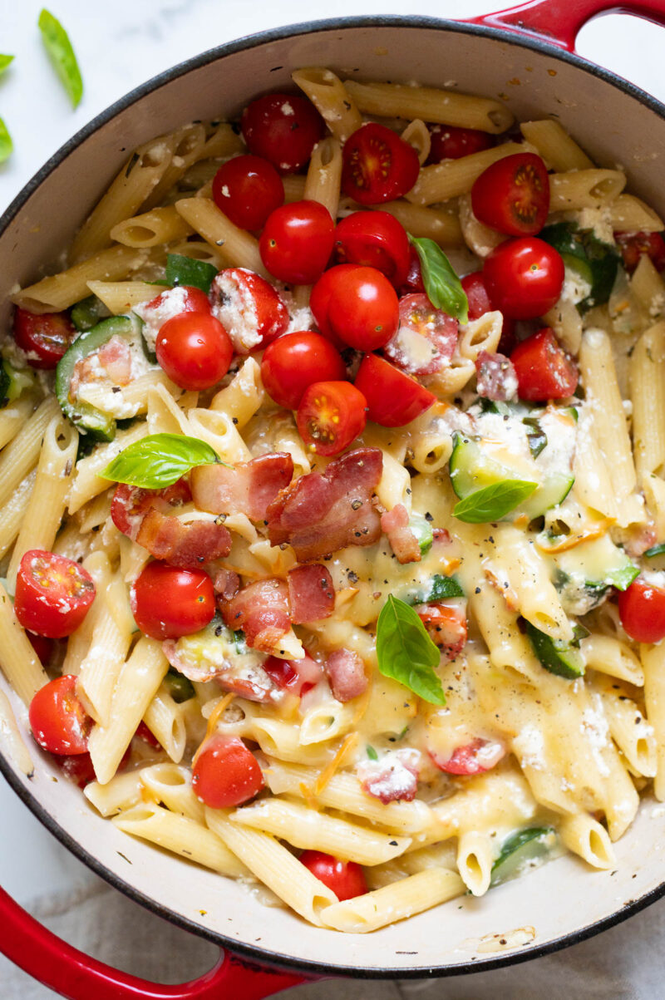 Make a pasta dish with garden fresh veggies and bacon for a creamy and filling dinner. Serve with bread for an easy meal that tastes even better than Olive Garden.
