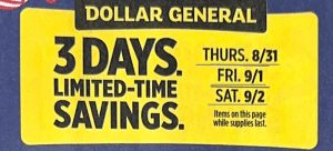 Dollar General 3 Day Sale 08/31-09/02 Dollar General will be having a three day sale 08/31-09/02. Here are the great
