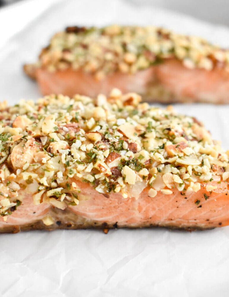 Salmon gets a crunchy coating of almonds to make this Valentine’s day dinner at home. You are going to love this paired with a salad and bread for an easy yet elegant meal.