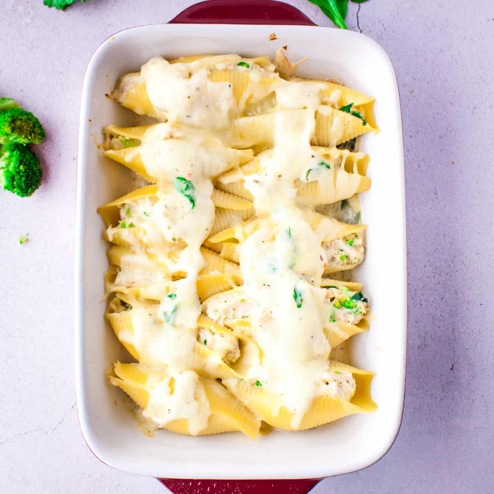 These stuffed shells are so tasty with chicken and spinach partnered with alfredo sauce.