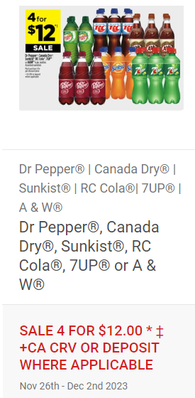 Dr Pepper®, Canada Dry®, Sunkist®, RC Cola®, 7UP® or A & W; SALE 4 FOR $12.00