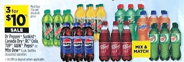 June 16 through June 22 at Dollar General 6 pack bottle Dr.Pepper. 7Up, Canada Dry, A&W RC Cola and Sunkist will be on sale 3 for $10.00 making each pack $3.33; We will update if a digital coupon becomes available.