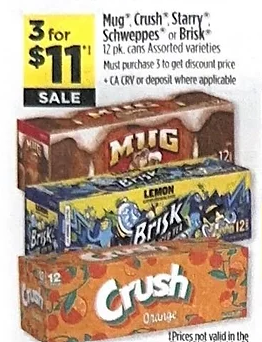 Mus, Crush, Starry, Schweppes, or Brisk Get 3 packs for $11.00 Making each pack $3.66