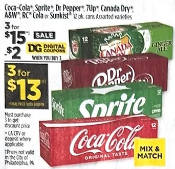 July 30-August 05, Dollar General has select Coca-Cola, Sprite, Dr. Pepper, Canada Dry, RC, Sunkist 12-packs on sale 3/$15. Clip the $2.00 off 3 soda 12-pack digital coupon and THREE 12-packs for only $13 – just $4.33 each!