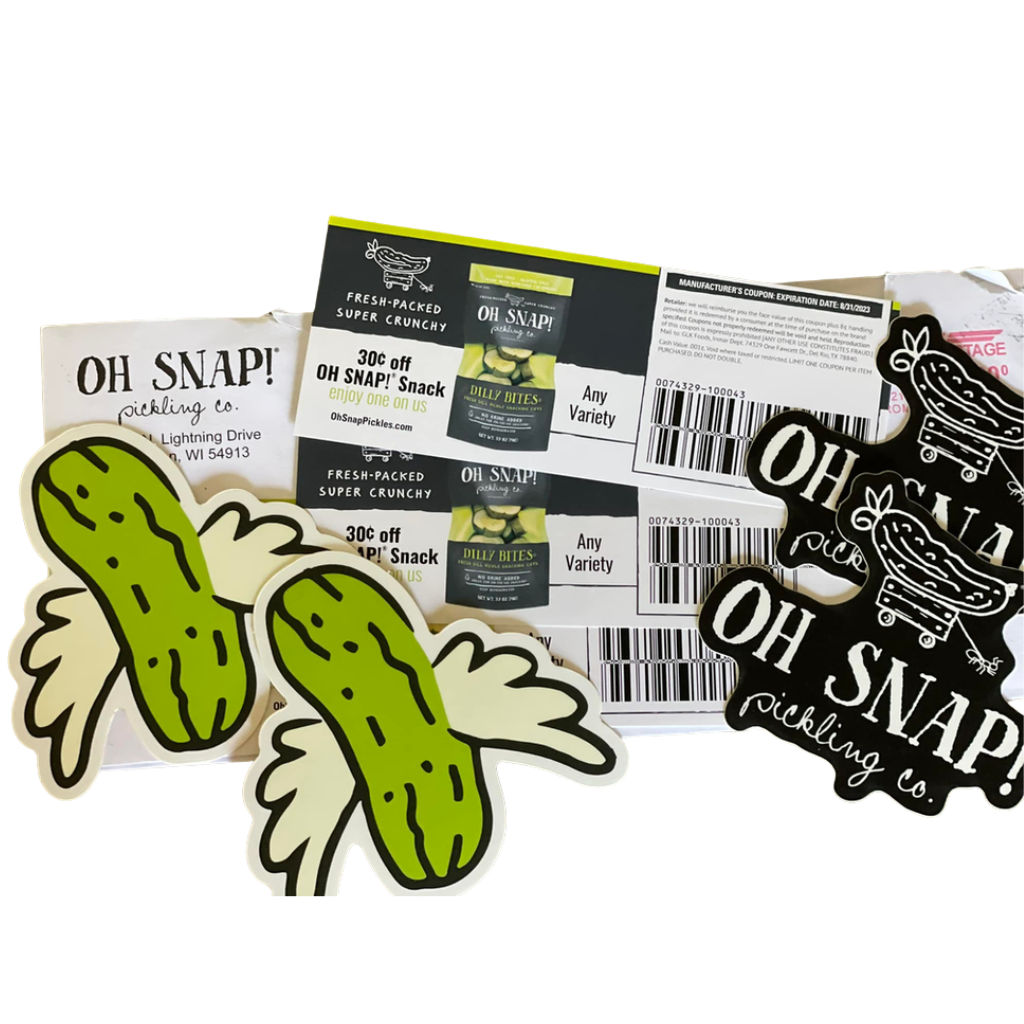 - Oh Snap! Pickling Co. – These fun pickle snacks come with personality! They’ve mailed coupons plus adorable pickle stickers to loyal fans.