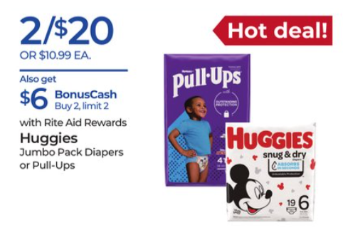 Deal; Huggies Jumbo pack diapers & Pull-ups get $6.00 bonus cash when you buy 2 @ $10.00 limit 2