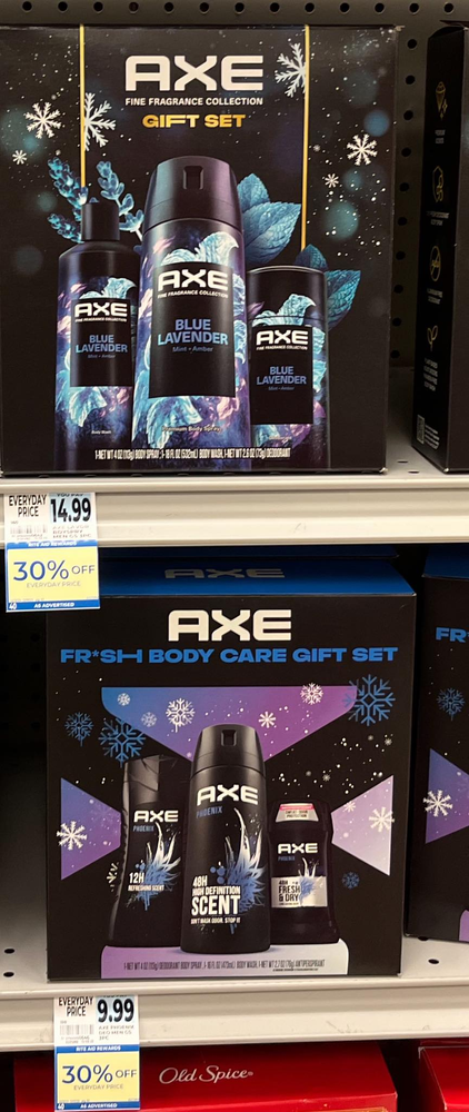 This deal can be done at Rite Aid during the week of 12/10-12/16. Starting 12/10 you can score Axe Gift Sets for $5.99 with 40% off the regular price of $9.99. The below pic was taken during the week when it was 30% off, it is showing the prices of the gift sets.
