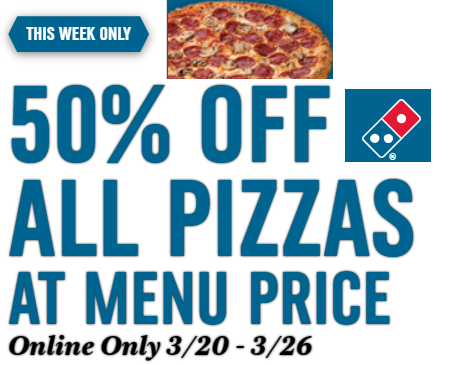 From 03/20-03/26 at Dominos Pizza you can score 50% off all your pizzas. Select this online only offer. Min. purchase required for delivery. Prices, participation, delivery area and charges may vary. Offer applies to the pizza portion of your order only.