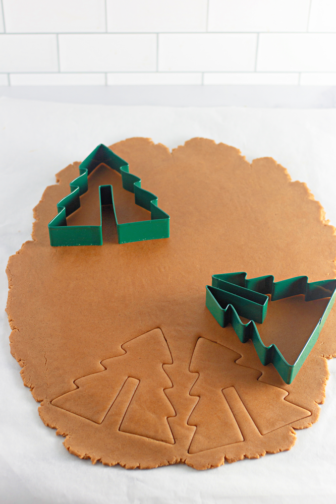 the dough out to ¼-inch thickness (the dough should be just slightly thinner than the cut out area of the cookie cutter where the cookies will interlock. If the dough is too thick the cookies will not interlock to form the trees).