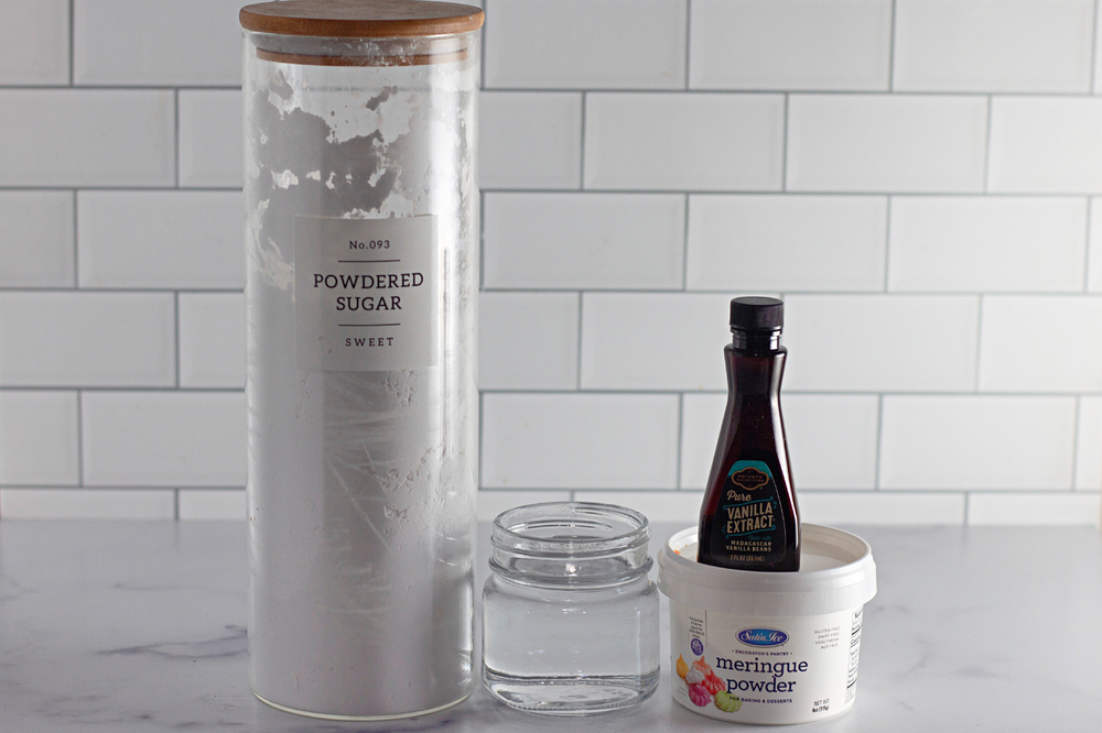 In a medium mixing bowl, beat together the water, meringue powder, and vanilla extract with an electric mixer on medium speed until soft peaks form.