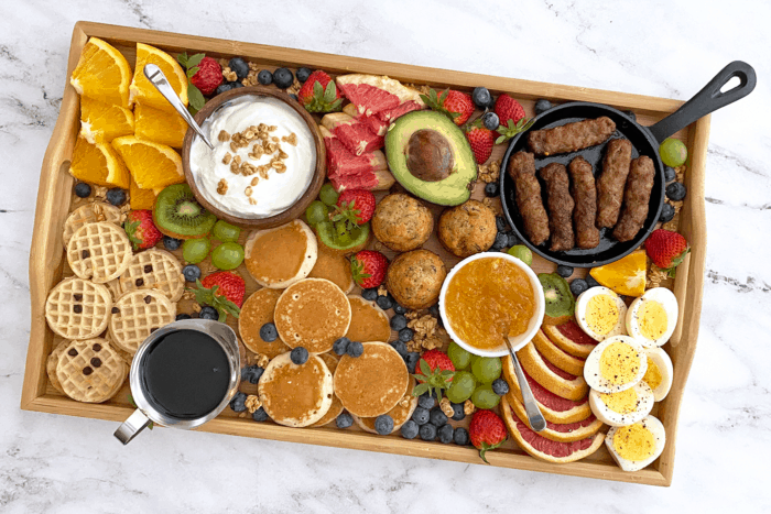 Breakfast Charcuterie Board: This board features all of the breakfast staples, like bacon, eggs, toast, and fruit. Don’t forget the jam and butter!