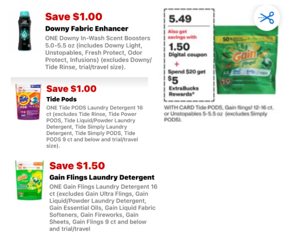 Tide PODS 25-42 ct., Gain flings! 31-42 ct., Downy 88 oz, rinse 48 oz, beads 12.2-14.8 oz, Gain sheets 240 ct., Bounce sheets 130 or 240 ct.;