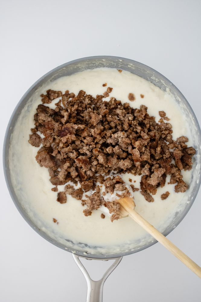 Once the gravy is at your desired consistency, add the sausage back in