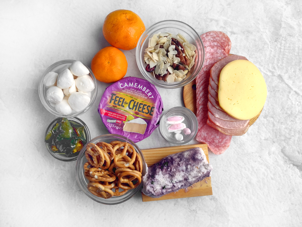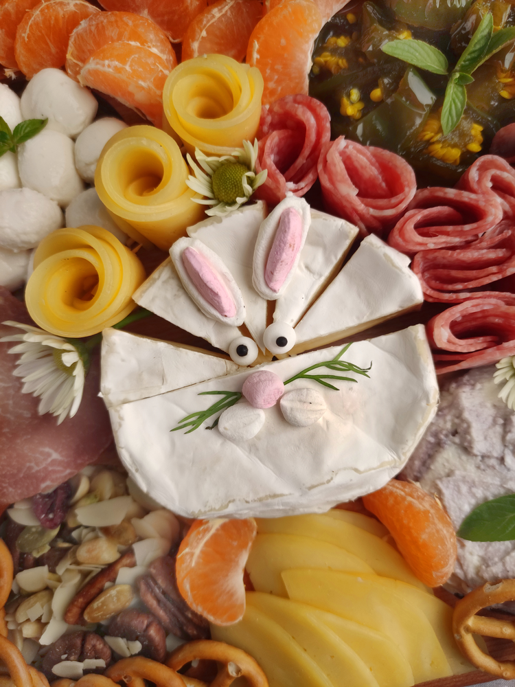 In anticipation of Easter, many hostesses are thinking about the holiday menu. Diversify the holiday table with a delightful combination of savory and sweet treats laid out in the shape of everyone's favorite symbol of the season – the Easter Bunny. This Charcuterie board is not only visually stunning, but also a delight for the taste buds, offering a range of flavors and textures to tantalize your senses. The recipe would be suitable for serving at brunch or a children's party. Use several types of cheese for this recipe. We recommend mild classic caramel cheese, mini mozzarella balls, gourmet young blueberry goat cheese and thin slices of hard cheese. Add fresh or canned jalapeño peppers for spice. We recommend the cowboy candy. When choosing salami and prosciutto, be guided by your favorite deli varieties. We complemented the board with brightly colored tangerine slices and crispy saltine crackers.