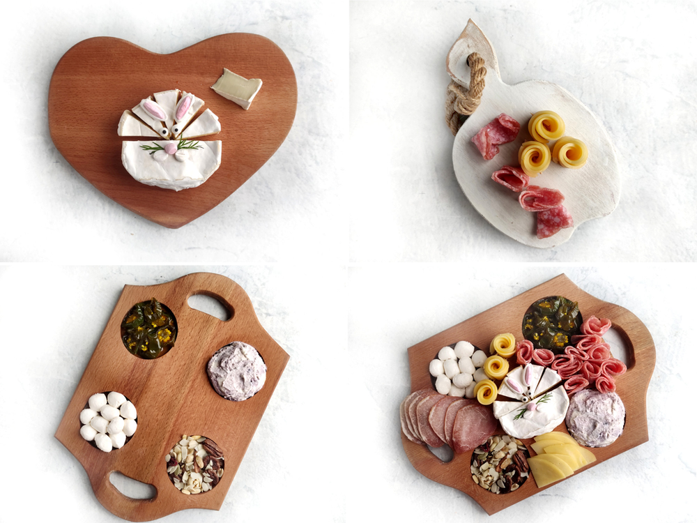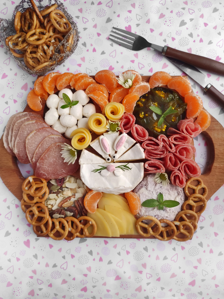 4. Place a bunny in the center of the board. Arrange the salami and cheese flowers around it. Arrange the cheese and prosciutto.