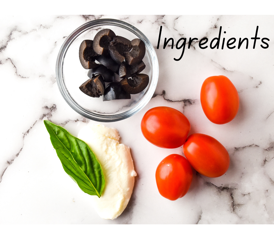The ingredients for this recipe are small tomatoes such as cherry or grape, bocconcini
