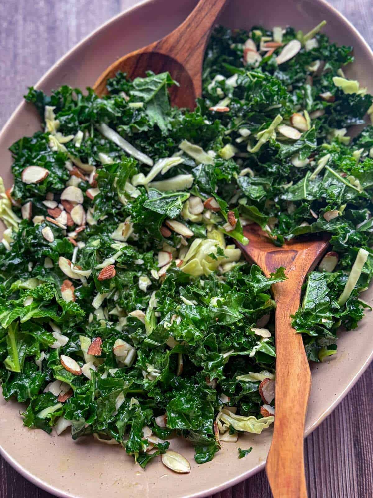Curly kale and chopped green cabbage serve as the crunchy base for this copycat Chick-fil-A kale salad recipe. Topped with crunchy almonds and a maple Dijon mustard vinaigrette, this superfood salad comes together super quickly and is the perfect healthy side with a totally addicting dressing.