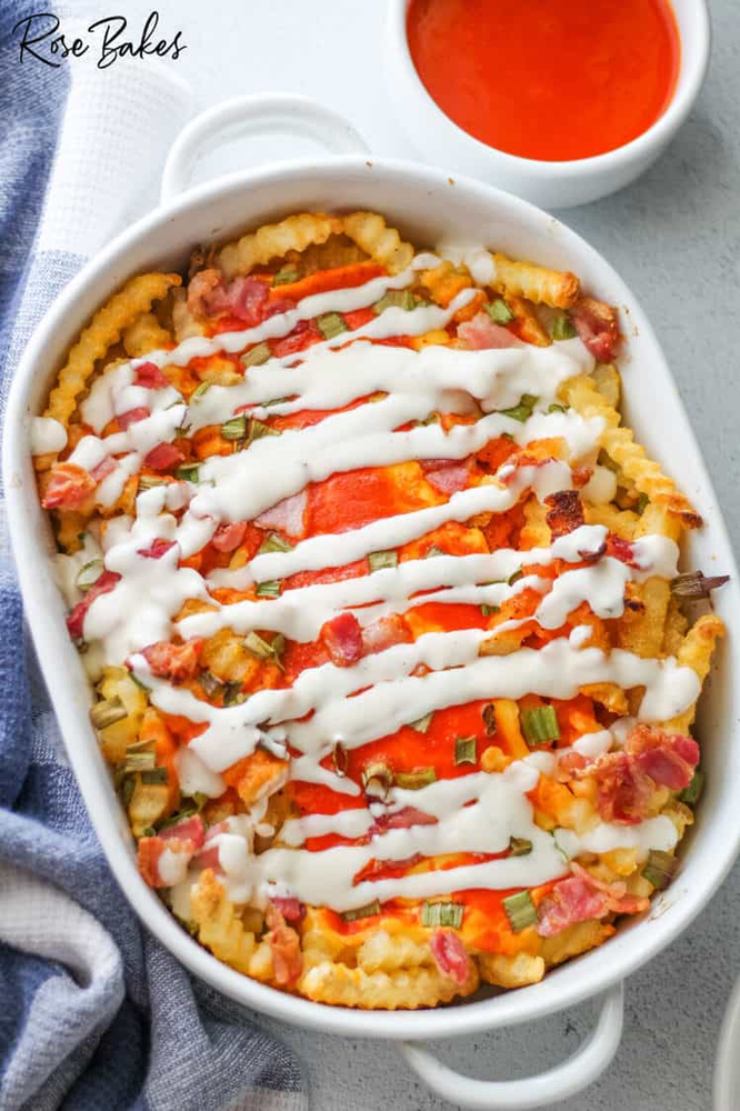 Have you seen this Viral TikTok Loaded Buffalo Cheese Fries Recipe? Nothing could be easier than this amazing and popular appetizer (for a crowd!) made with frozen fries, Velveeta Cheese, Wing Sauce & Ranch Dressing… all the ooey-gooey deliciousness in one dish! Your crowd will love it!
