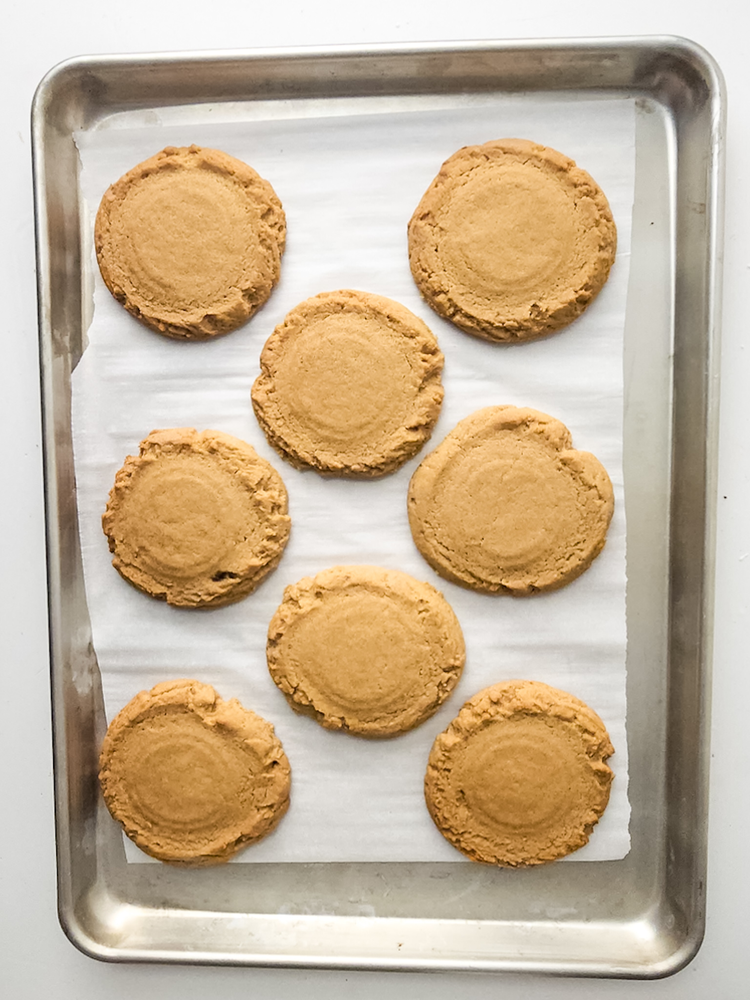 Use the bottom of a clean glass to press the center of each cookie and flatten, leaving a slight crinkly edge to each cookie, perfecting for filling with the key lime filling later.