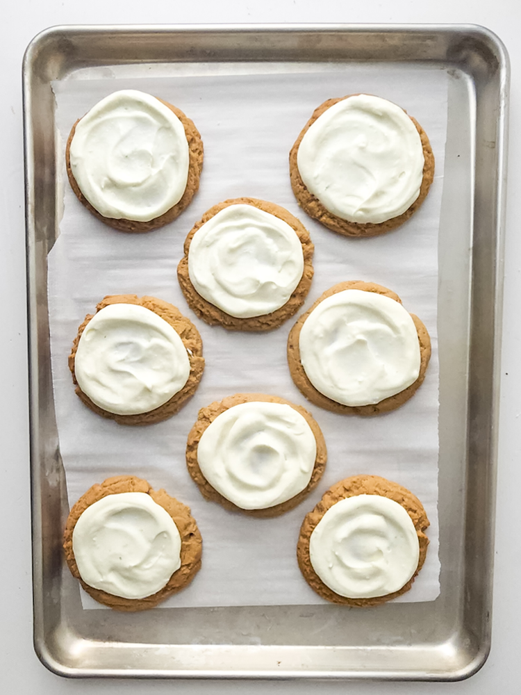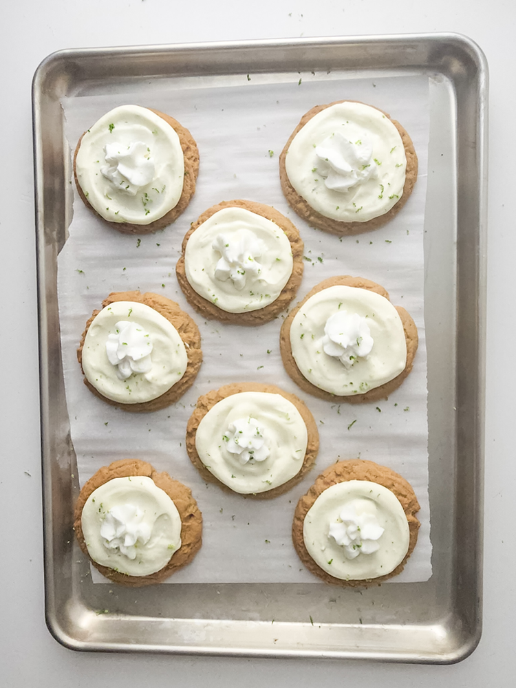 Once the cookies have cooled, take a large tablespoon of the key lime filling and transfer to the center of each cookie. Spread evenly with the spoon creating a thick layer of filling.