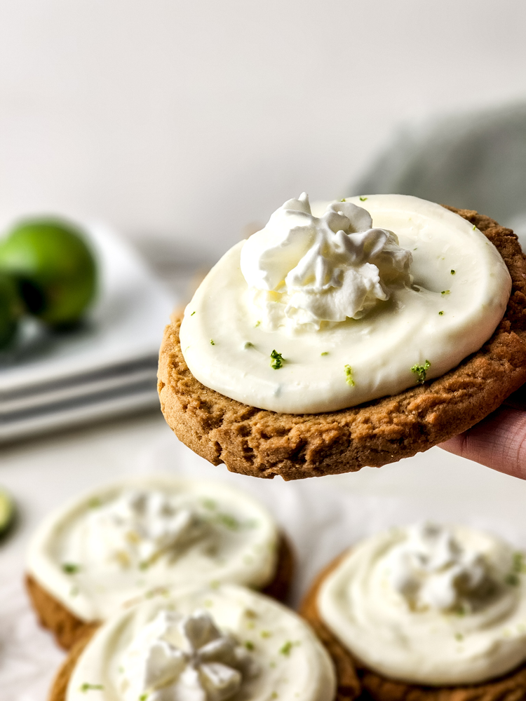 This Crumbl copycat keylime pie cookie is a graham cracker cookie base topped with a homemade key lime pie filling, whipped cream, and a wedge of lime to finish these copycat Crumbl key lime pie cookies!