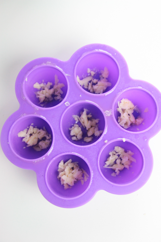 Grease a silicone muffin tray or egg bite tray and sprinkle a bit of Monterey jack into each cavity.