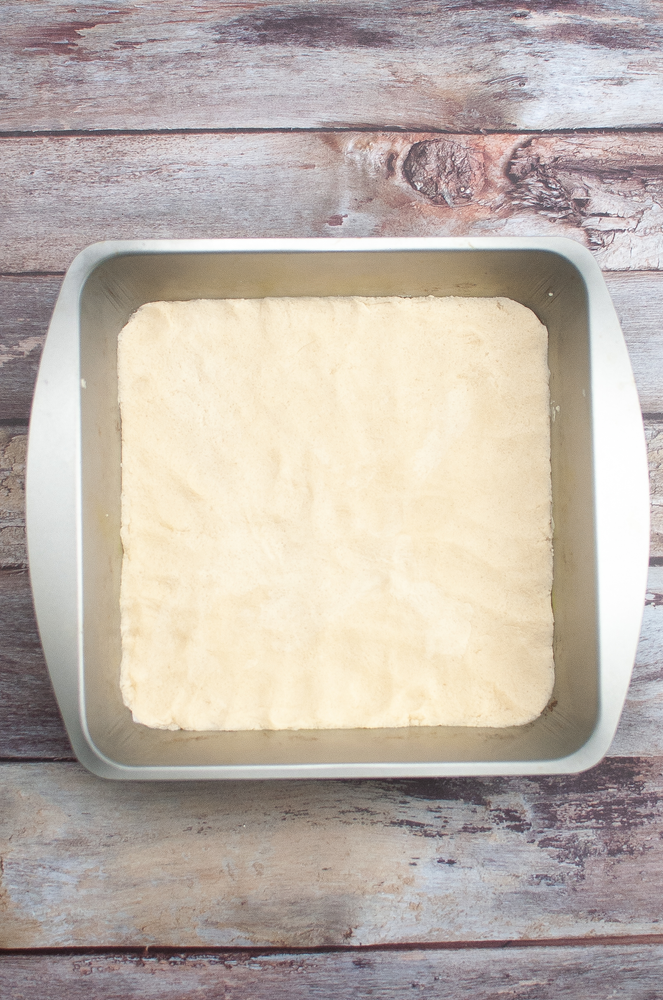 Spread the dough evenly into the bottom of the prepared baking pan.
