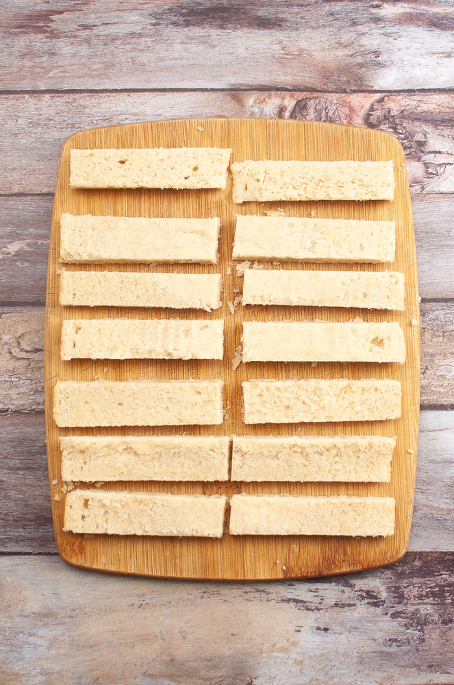 Once cooled at room temperature, cut the cooled shortbread crust into 1 x 4 inch bars.