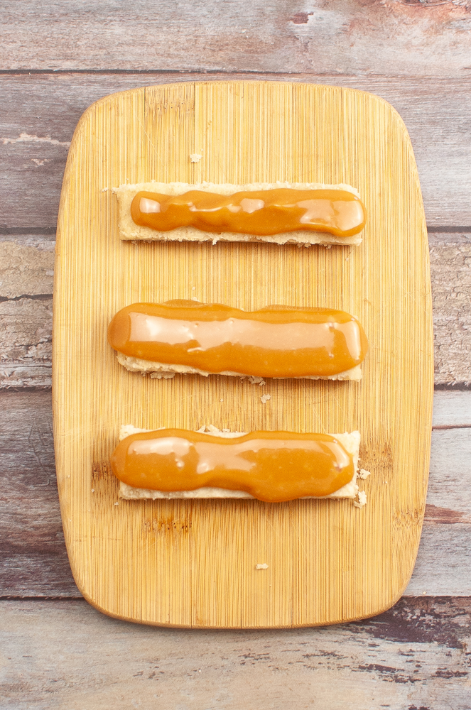 Add the cooled caramel to piping bag and then pipe the caramel onto the top of the cookie bars.