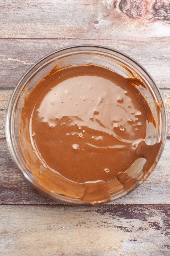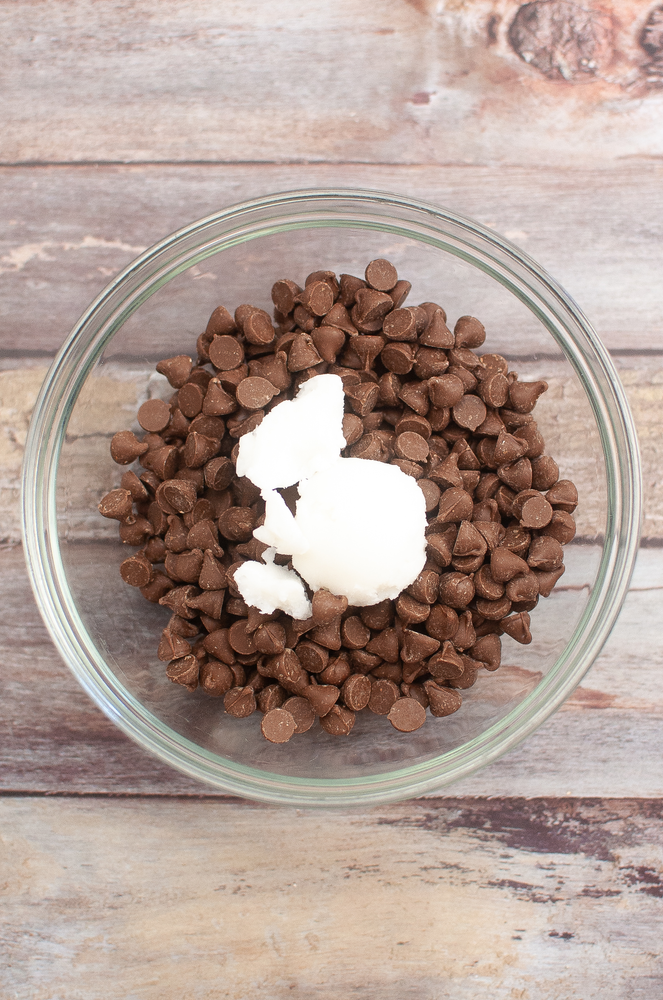 Melt the chocolate chips and coconut oil together in the microwave. Stir until the mixture turns smooth, then allow it to cool.