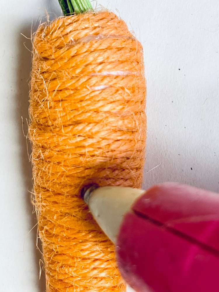 Next add a line of glue down the side of a carrot and press firmly onto the wire basket. Repeat this process until the entire basket is covered with the carrots.