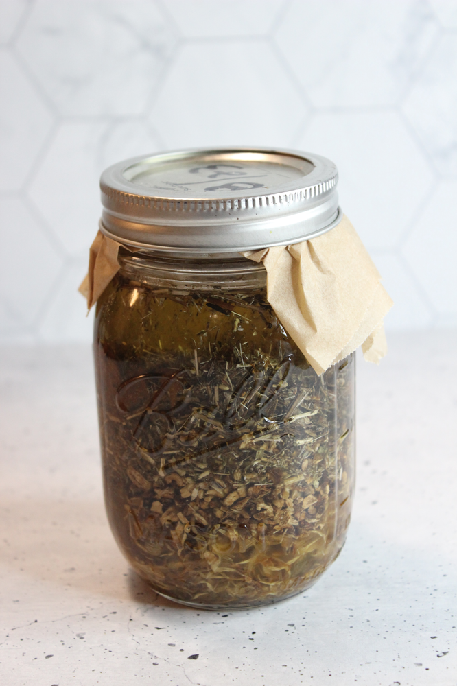 2. Pour the carrier oil to cover the herbs completely. Store for a couple of weeks, shaking the jar every few days. Then, strain.