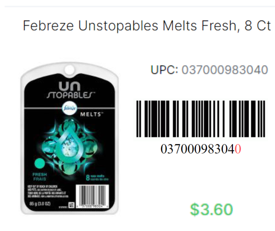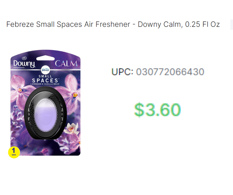 Febreze Small Spaces Downy Calm 1ct 0307-7206-6430 Febreze Small Spaces HD Kitchen .25oz-1ct 0307-7203-1896 Febreze Wax Melts Fresh Unstpb 8ct 0370-0098-3040