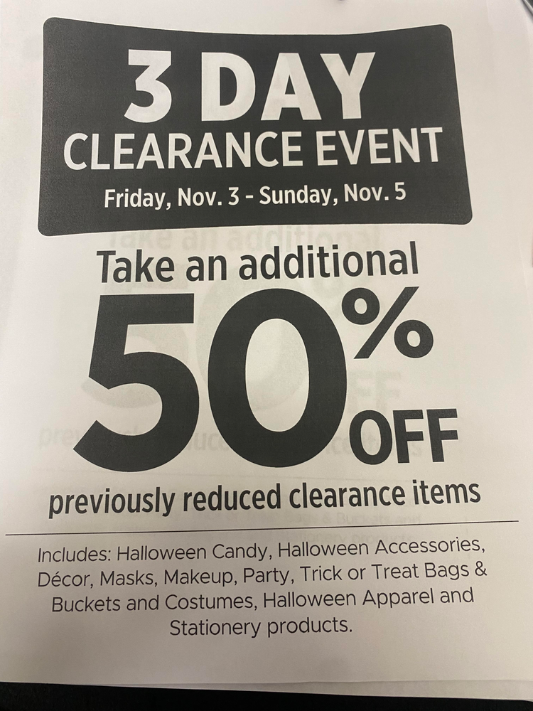 What is on sale? Take an extra 50% off of these items ONLY; THIS IS NOT CORE; READ THE SIGNS Includes: Halloween Candy, Halloween Accessories, Décor, Masks, Makeup, Party, Trick or Treat Bags & Buckets and Costumes, Halloween Apparel and
