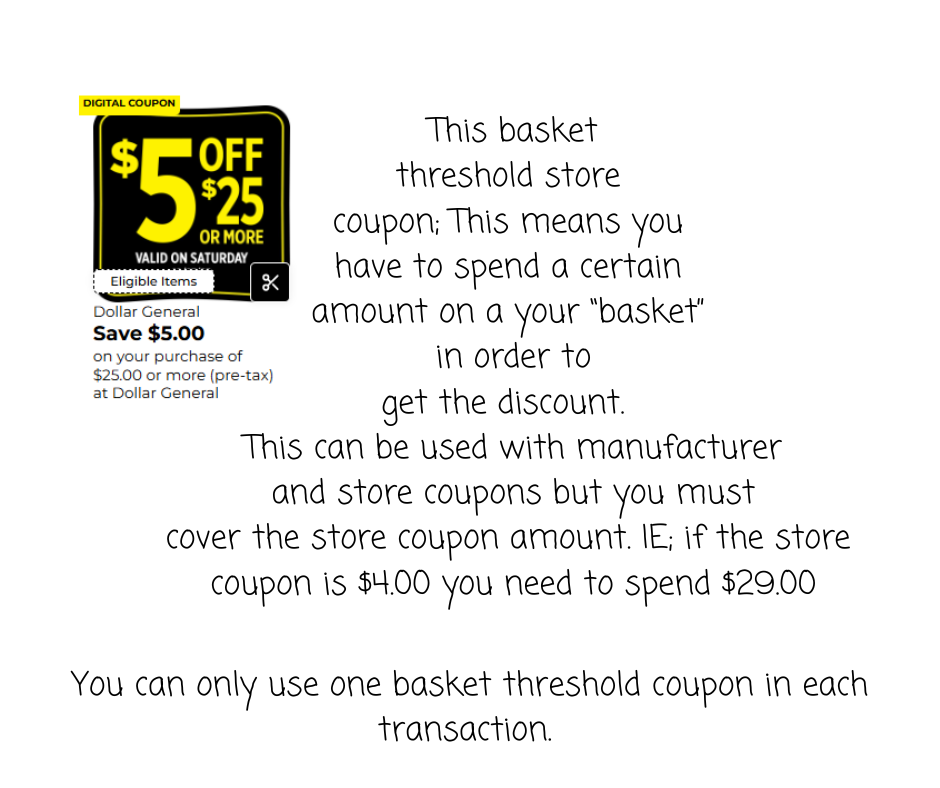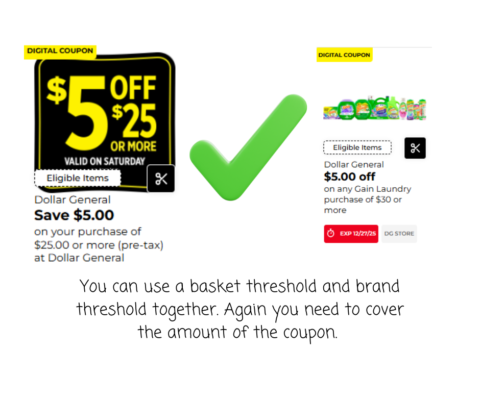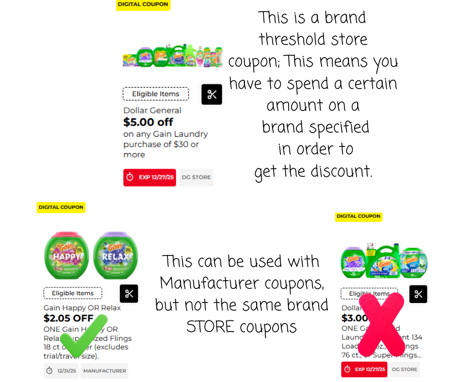 While Dollar General typically limits transactions to one store coupon, there are special circumstances where two store coupons can be stacked together successfully. This usually happens when one coupon is a basket threshold coupon (such as $5 off $25) and the other is a brand threshold store coupon (like $5 off $30 in Gain products). Because these coupons apply to different requirements—one to your total basket and one to a specific brand—they can be used together as long as you meet each coupon’s spending threshold after all other coupons are applied. It’s important to note that brand threshold store coupons cannot be combined with another store coupon for the same brand, but they can be paired with manufacturer coupons. As always, make sure your totals meet the required amounts and remember that only one basket threshold coupon is allowed per transaction.