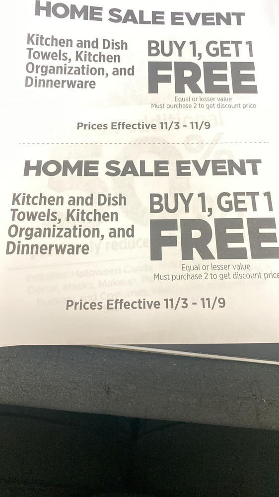 Dollar General Home Sale Event Buy 1 Get 1 FREE 11/03-11/09 includes kitchen and dish towels, kitchen organizational, and dinnerware.