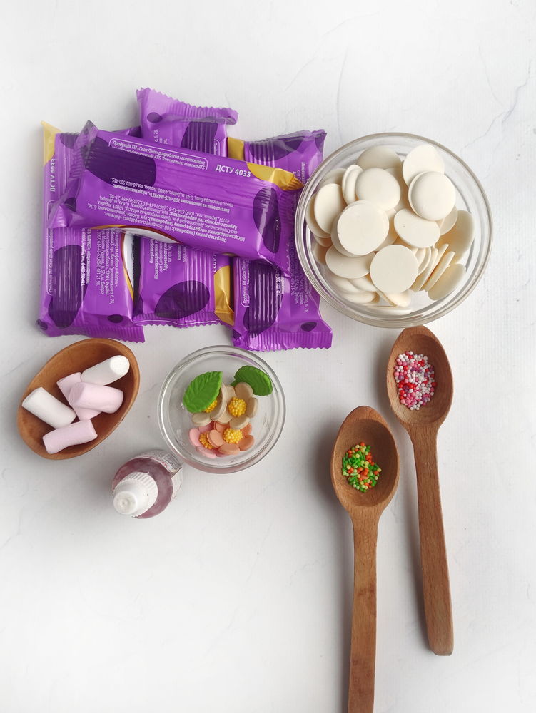 Prepare these bars for the Easter holiday. Your guests and especially your children will be delighted. They are easy to prepare, you don't need pastry bags or special spatulas. The drawing is applied with a simple teaspoon. As a basis you can take your favorite chocolate bars or waffle candies with filling. Those on a diet can choose vegan or gluten-free sugar-free options. We will use white chocolate, various sprinkles and flowers for the design.