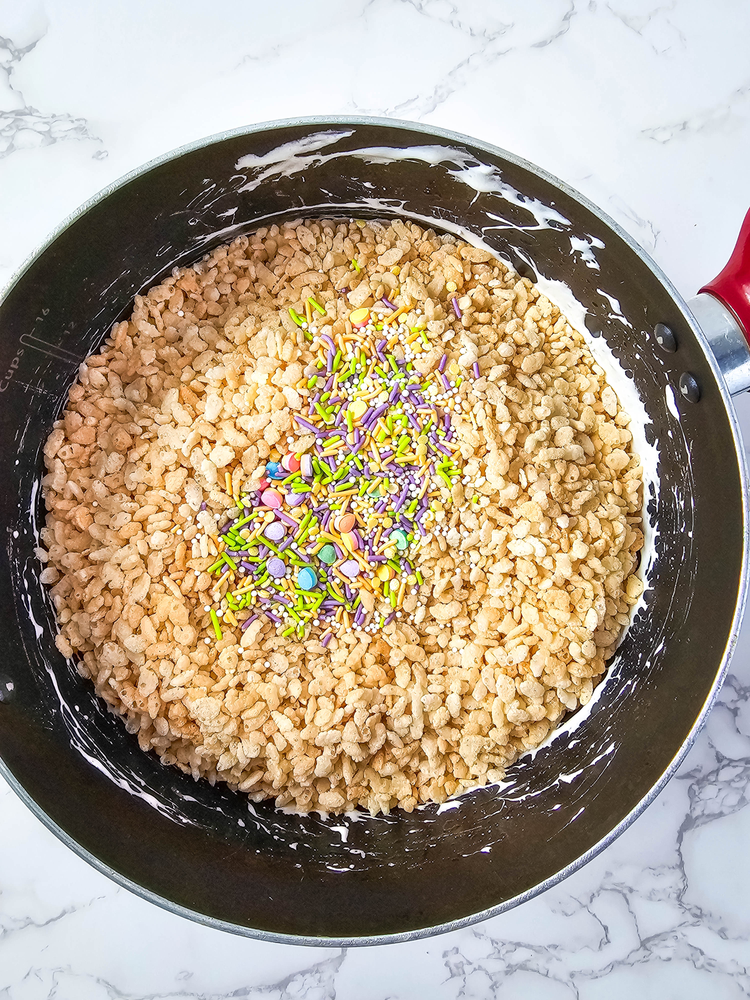 Add the Rice Krispies and sprinkles, stir well to completely combine.