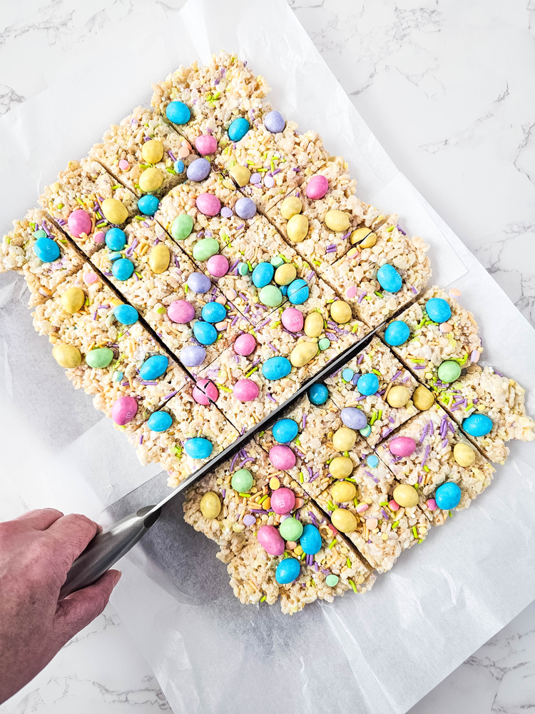 A classic Rice Krispies Treats recipe, with Easter sprinkles mixed in, and topped with pastel M&Ms make a perfect treat for the holiday!