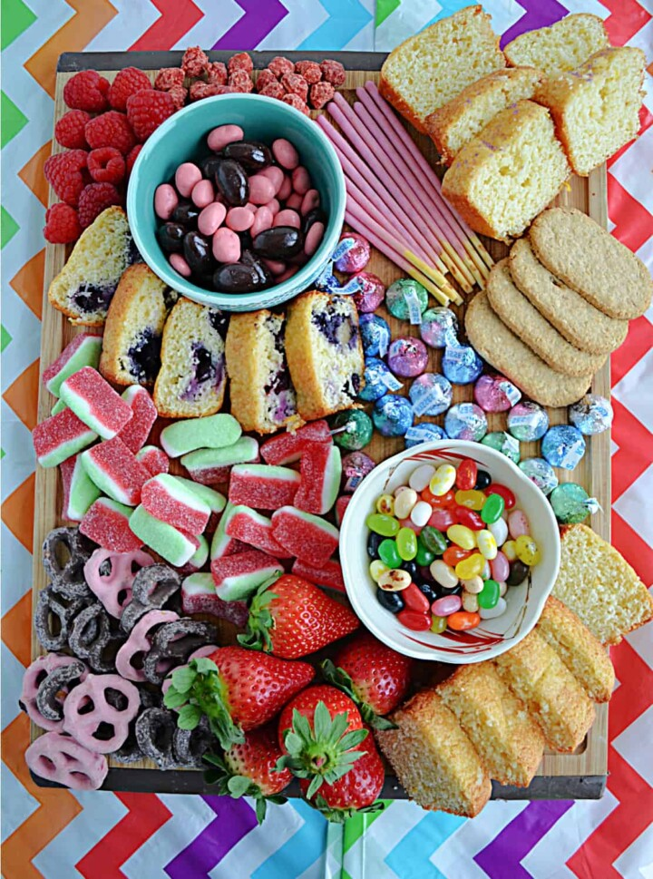 Let your friends and family choose their own Easter sweets from this colorful collection of candies, cookies, fruits, and sweet quick breads on this Easter Dessert Charcuterie Board.