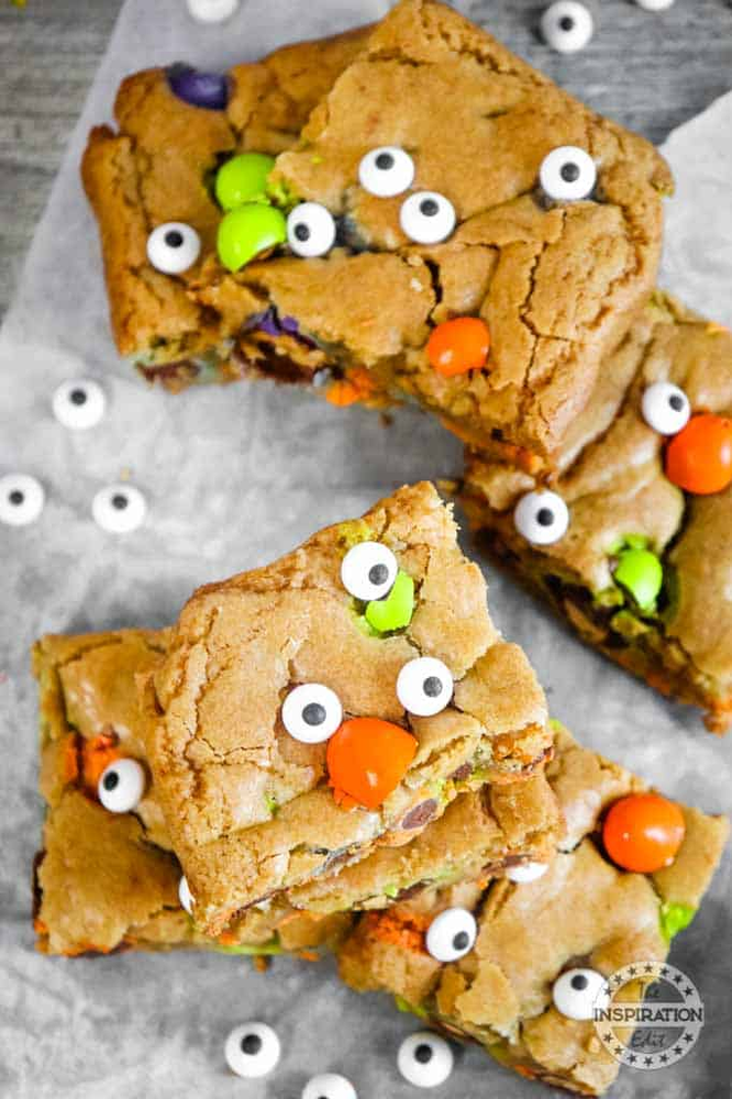 This blondie recipe is perfect for sharing with all of your favorite ghouls and goblins on Halloween! The candy eyes give them a festive feel.
