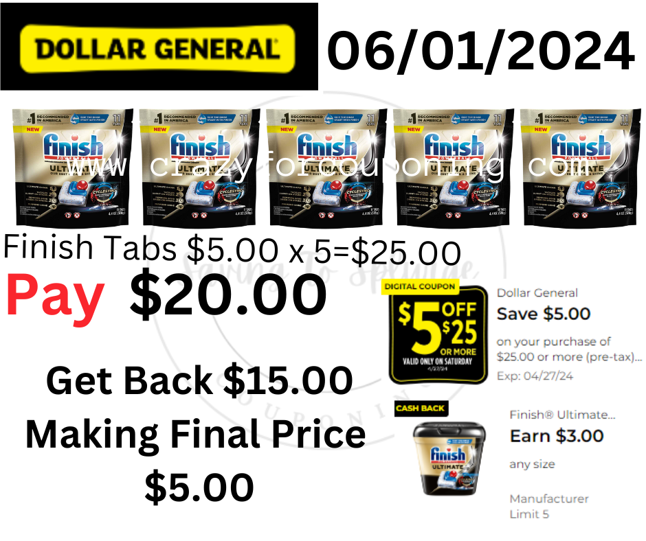 Are you tired of scrubbing away at dirty dishes? Look no further! This Saturday, June 01, Dollar General is offering an unbeatable deal on Finish Powerball Ultimate Dishwasher Detergent Tabs. With the $5 off $25 coupon and cash back rebate, you can score 5 bags of these powerful cleaning tabs for a fraction of the price. Say goodbye to tough stains and hello to sparkling clean dishes – all without breaking the bank! Read on to learn how you can take advantage of this amazing offer before it's gone.